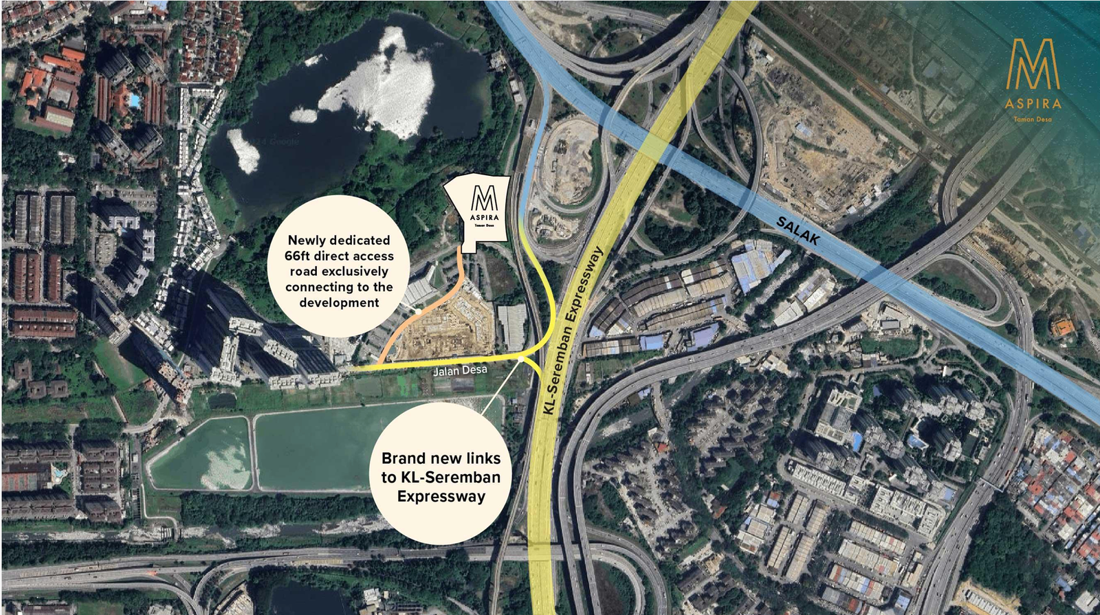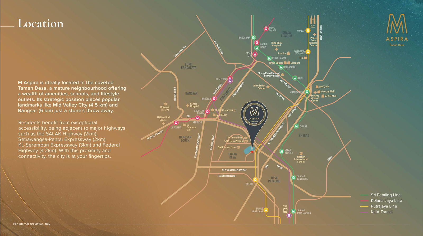 M Aspira @ Taman Desa is situated in the well-established neighbourhood of Taman Desa, offering convenient access to key destinations across Kuala Lumpur. The development is surrounded by essential amenities including shopping malls, schools, healthcare centres and everyday conveniences. Within a short drive, residents can reach Mid Valley Megamall, KL Eco City, Bangsar South and Kuala Lumpur City Centre. Its strategic placement near major highways such as the Federal Highway, MEX, NPE and KESAS provides smooth connectivity to Petaling Jaya, Old Klang Road and surrounding areas. This central location offers a balanced urban lifestyle with accessibility, comfort and strong infrastructure support.